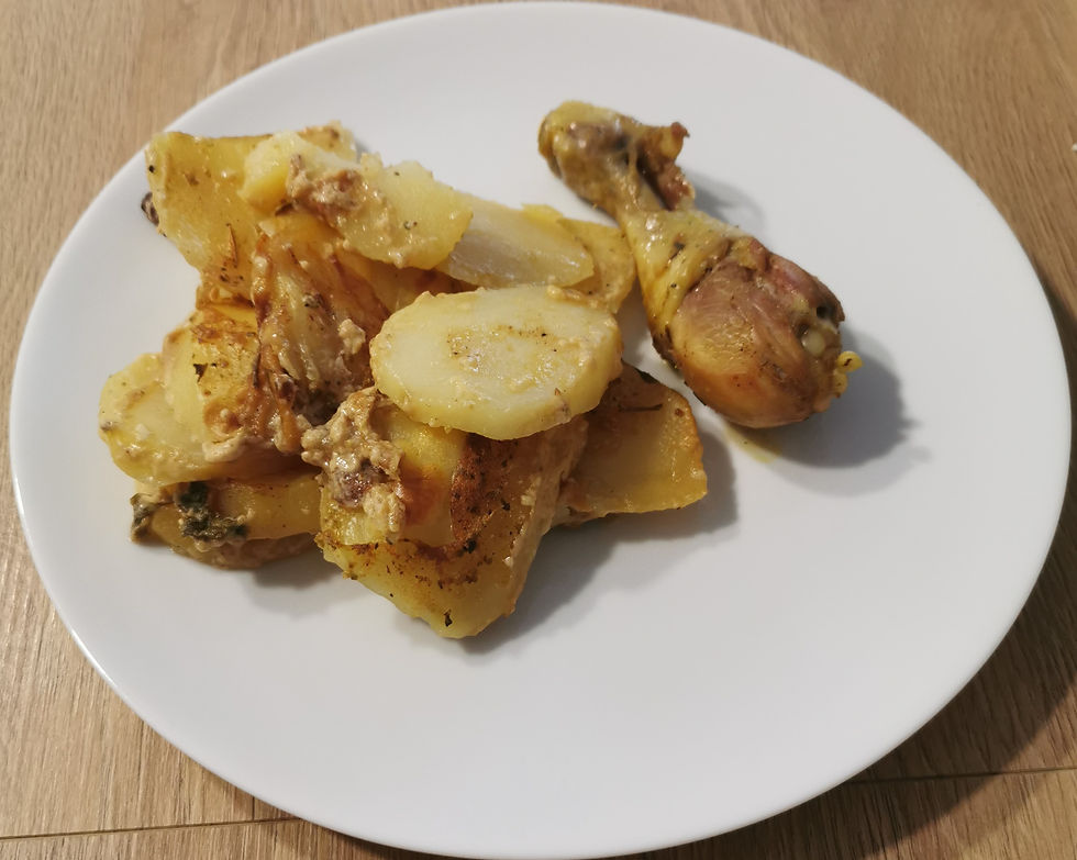 6. Enfournez les pommes de terre et les pilons de poulet pour 45 min à 1 heure de cuisson.
